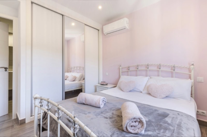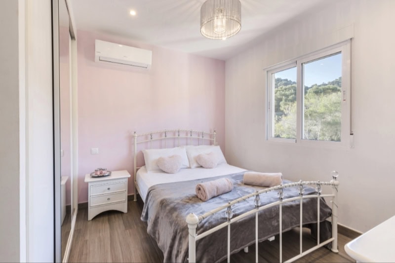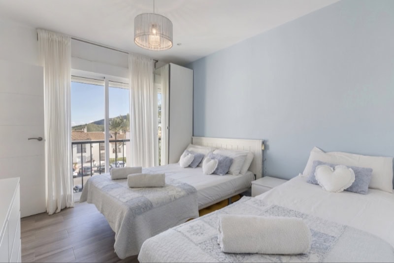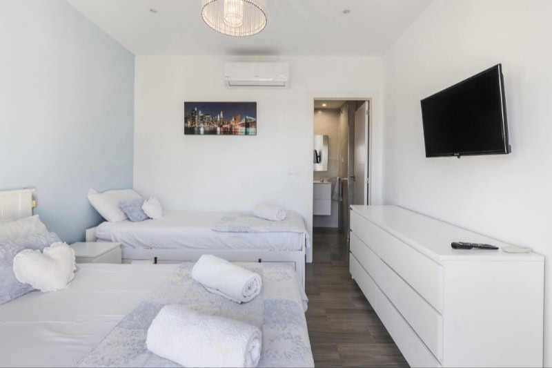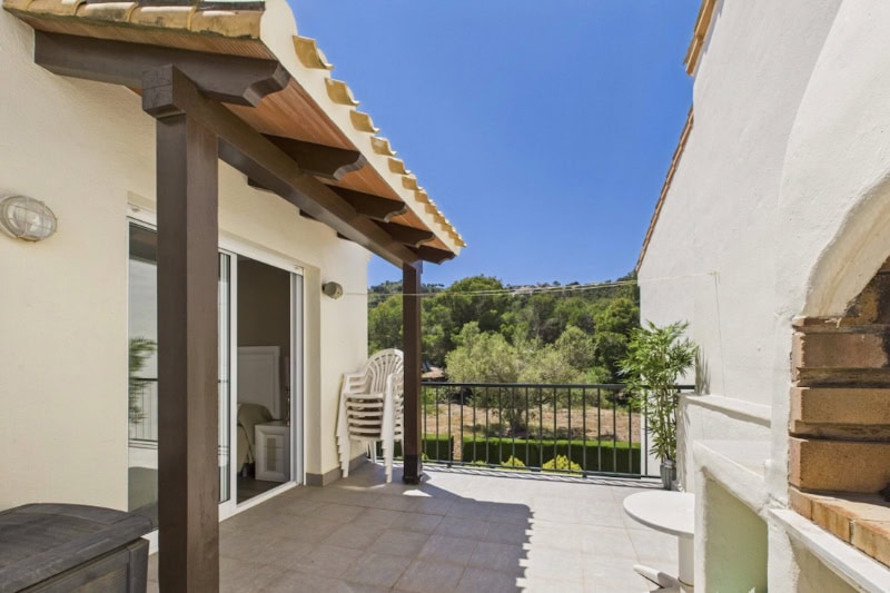From the kitchen, access the smaller balcony which provides dining space for four people with lovely mountain views. There are three en suite bedrooms. One bedroom has both a double bed and one single bed, and another two bedrooms offering a double bed each.