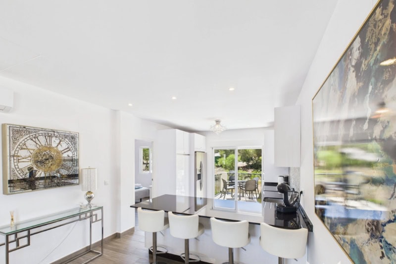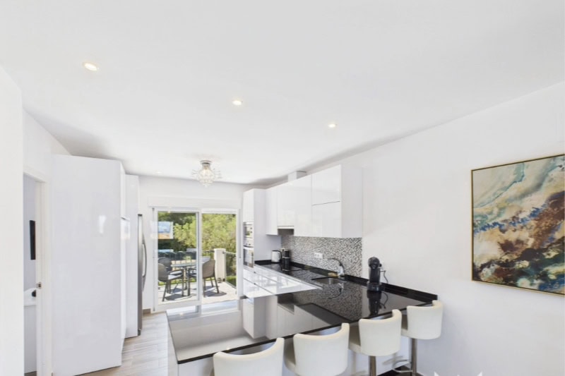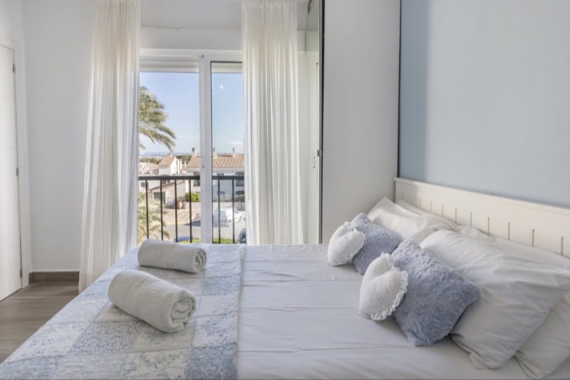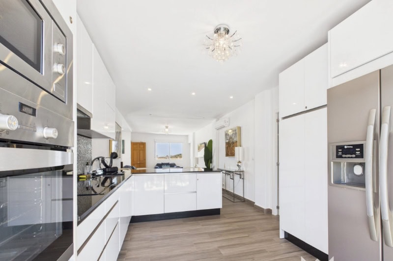 Step into this modern penthouse apartment and be greeted by a wonderful open-plan living and kitchen area with direct access to the patio which offers phenomenal sea views of the Mar Menor below. Furnished with comfortable sofas, a TV, and equipped with air conditioning, this space provides a comfortable retreat. There is a fully modernised kitchen, equipped with appliances and utensils, including an ample American fridge freezer. This is the perfect space to socially cook, dine and chat with family or friends.