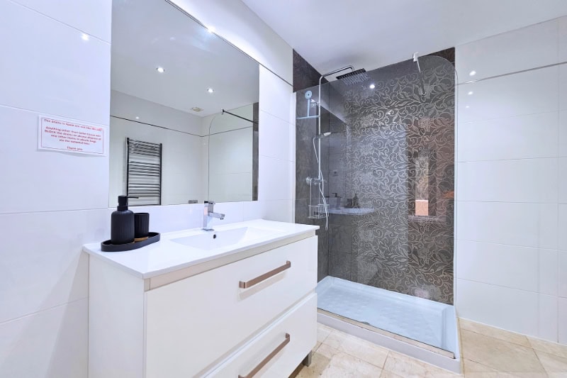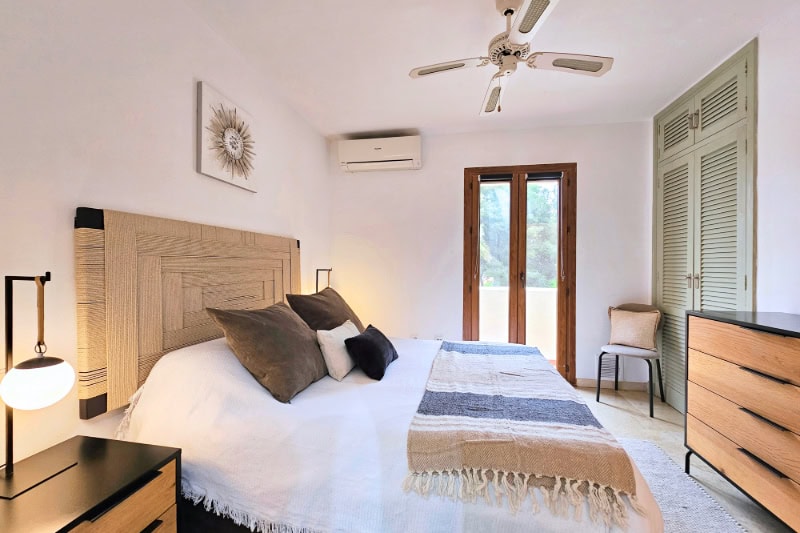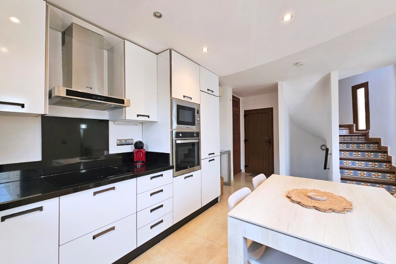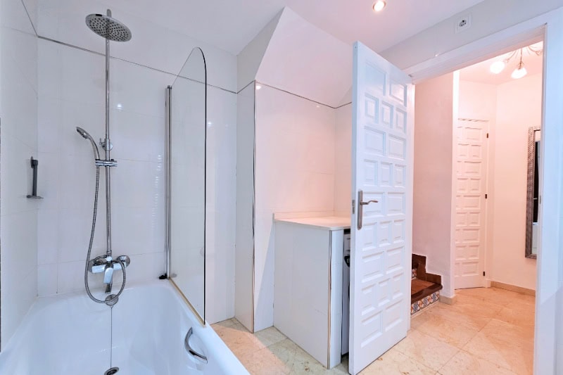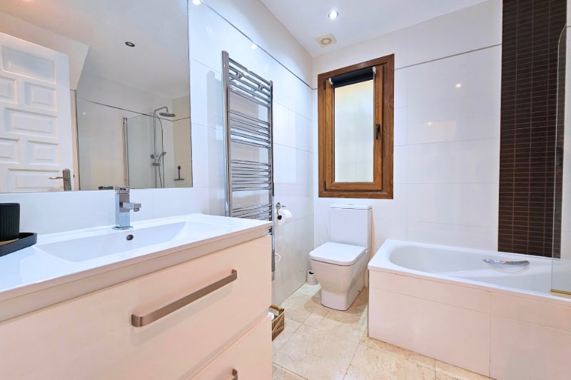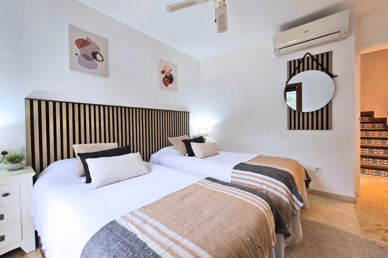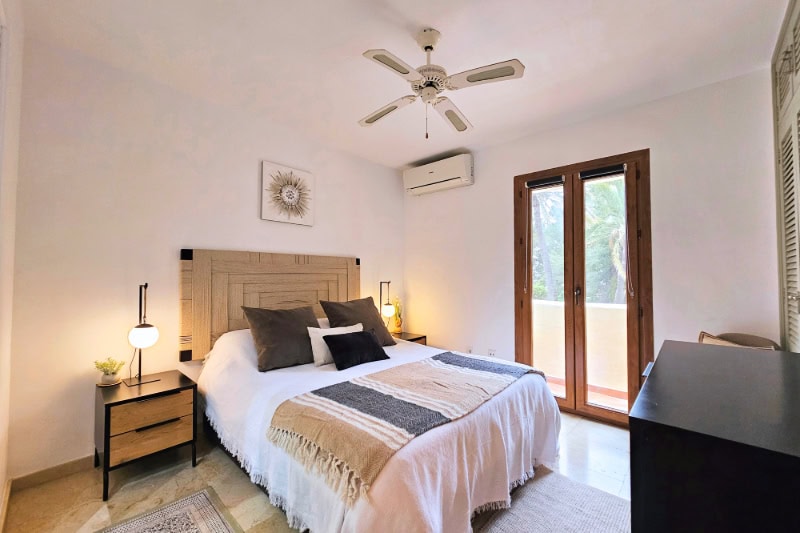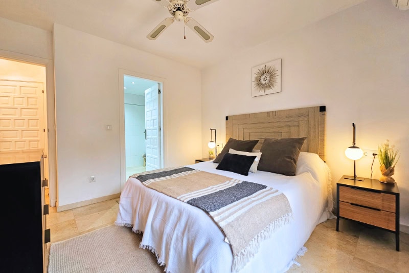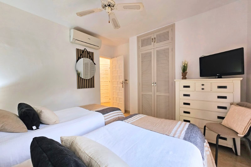 From the lounge there is a staircase down to the bedrooms and bathrooms. The master bedroom has a double bed, an en-suite bathroom and has patio doors to a ground floor terrace which is next to one of the communal swimming pools and the gardens. The second bedroom has twin beds and also has patio doors to the ground floor terrace with access to the pool and the gardens. This bedroom has the use of a separate bathroom. There is a washing machine in a hall cupboard.