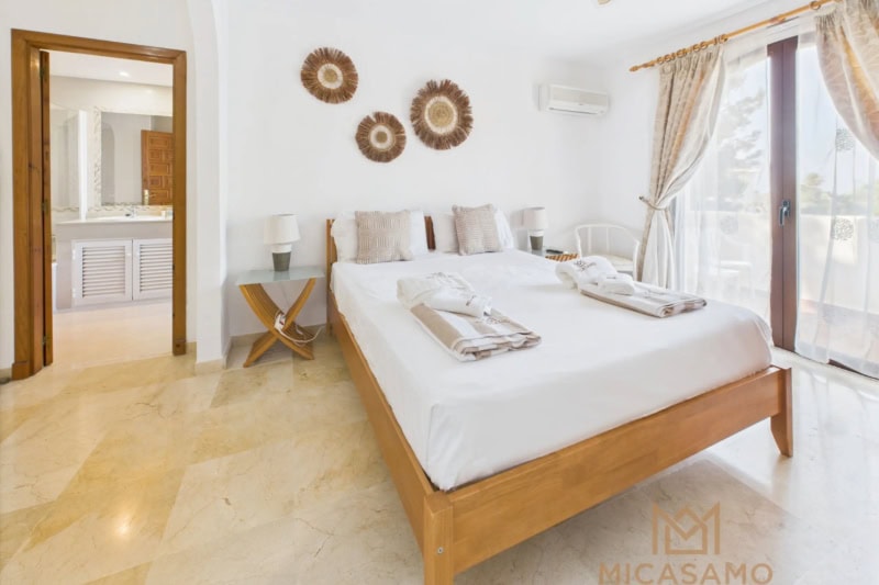 Accommodating up to six people, the villa features three spacious bedrooms. The master bedroom includes a private en-suite bathroom, while the other two bedrooms share a functional family bathroom. Each room is designed with relaxation in mind, ensuring a peaceful and comfortable stay for all. Additionally, a convenient guest half bathroom on the main level provides added practicality for visitors.
