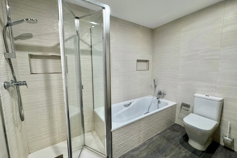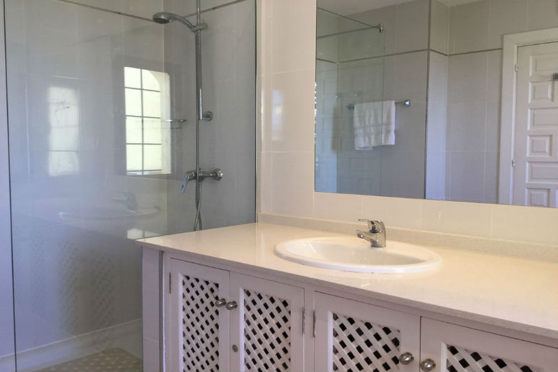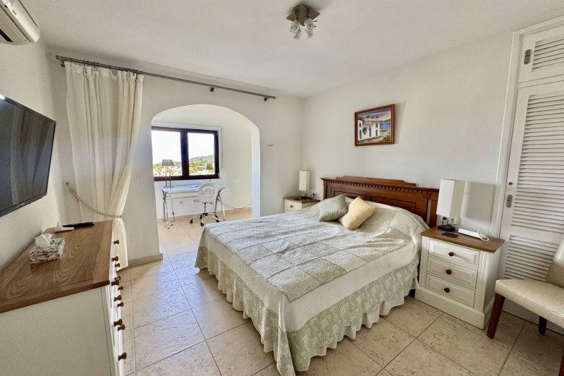 Stairs lead down to the extended master bedroom with kingsize bed and separate area with sofa, fitted wardrobes, patio doors lead to the terrace and outdoor pool. The en-suite bathroom has twin sinks and walk in double shower.