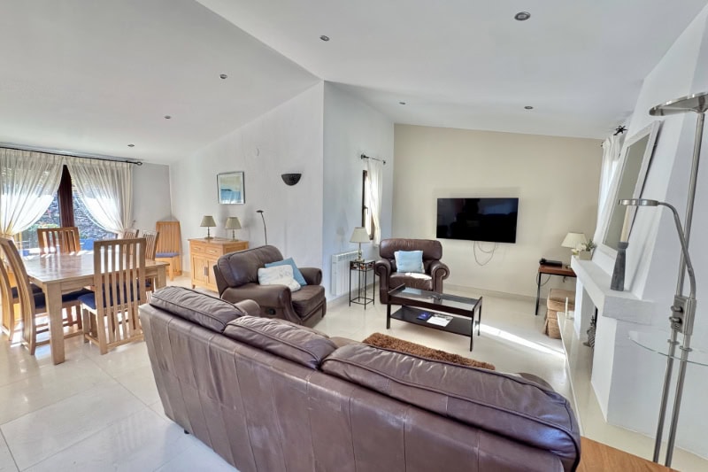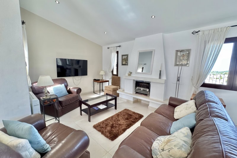 Stunning living room with separate dining room beautifully decorated and furnished with ample seating and vaulted beamed ceiling making it very light and airy. British TV channels and dvd player. Patio doors lead to the terrace with built in barbecue and dining furniture and breathtaking views across La Manga Club and the surrounding area. Further steps lead to the upper sun terrace with offers sunbeds for all day long sunbathing. A further set of patio doors lead off the dining room to a further courtyard dining area.