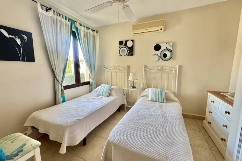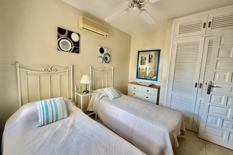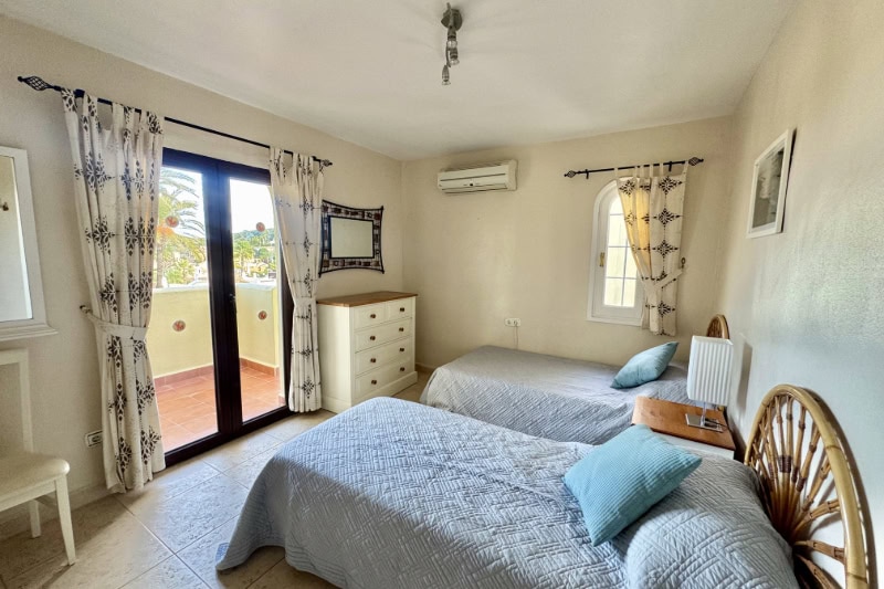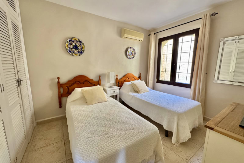 Twin bedroom with fitted wardrobes and patio doors that lead to the terrace and outdoor pool.
