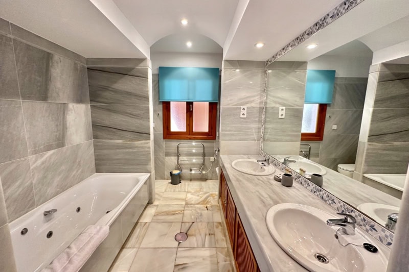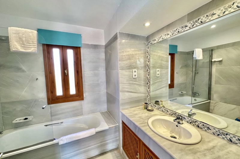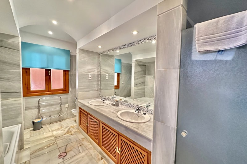 On the ground floor are the three bedrooms, the extended master bedroom has a double bed, patio doors to the garden and pool and an en-suite bathroom which has a bath, separate shower, twin basins and wc. The second bedroom has twin beds, patio doors to the garden and pool and an en-suite bathroom with bath and shower, wash basin and wc. The third bedroom has twin beds, fitted wardrobes and patio doors leading to the front of the property